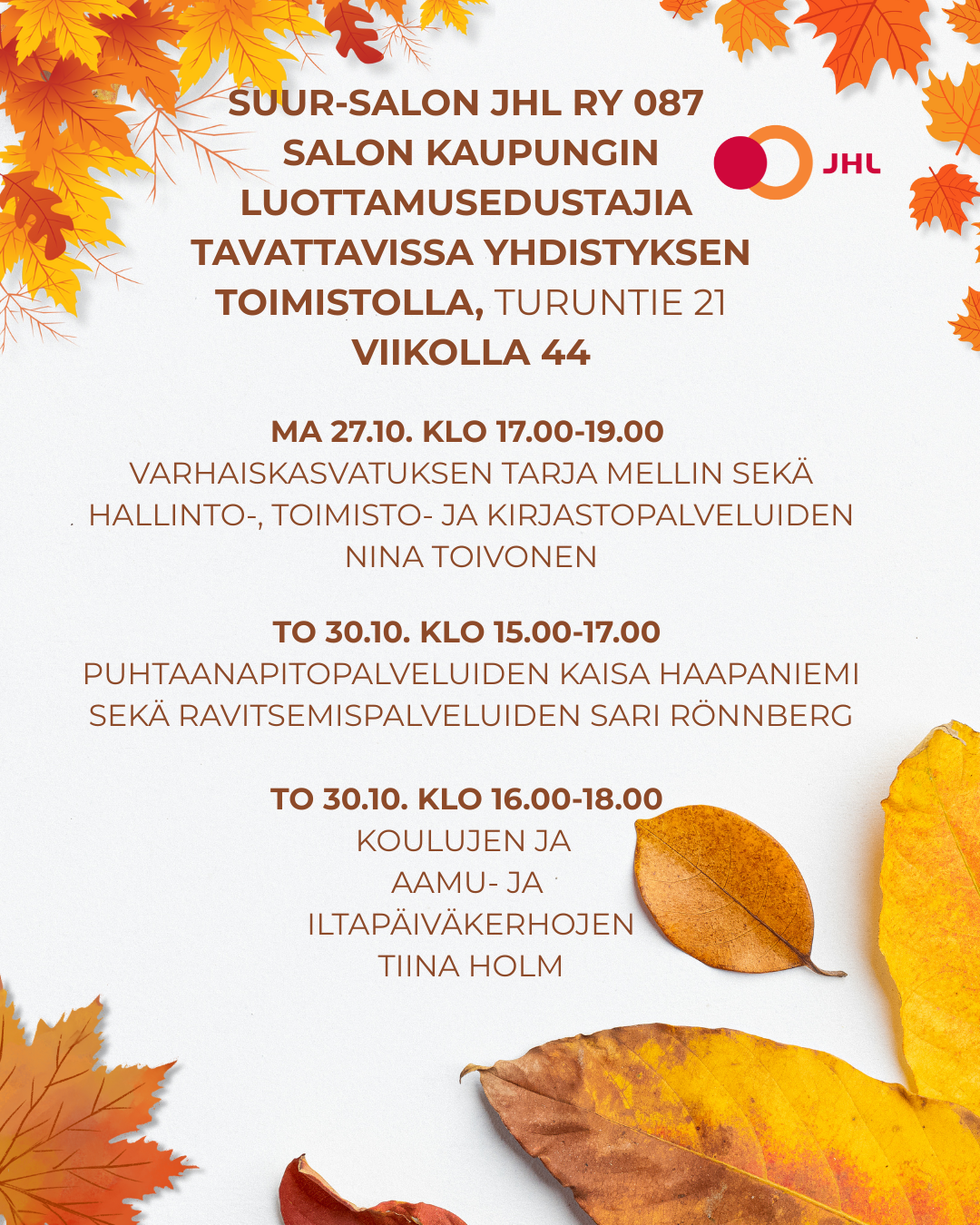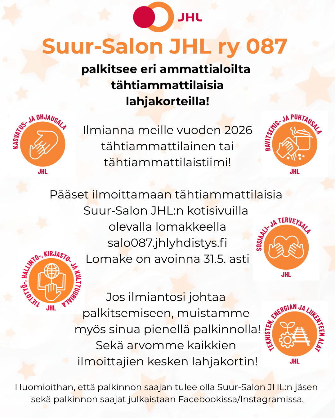 Liity jäseneksiJHL:n jäsenenä saat edunvalvontaa, tukea ja turvaa. JHL neuvottelee, jotta sen jäsenistön yhteiskunnallisesti tärkeän työn arvostus näkyisi kukkarossa ja hyvinvointina työelämässä. Jäsenenä saat myös monia jäsenetuja käyttöösi. JHL on vakuuttanut jäsenensä Keskinäinen vakuutusyhtiö Turvassa. Vakuutus tarjoaa monipuolista turvaa matkoilla ja vapaa-ajalla. Liittyessäsi JHL:n jäsenkesi liityt myös Julkisten ja hyvinvointialojen työttömyyskassan jäseneksi, ja sinulla on mahdollisuus saada ansiosidonnaista työttömyyspäivärahaa, liikkuvuusavustusta ja vuorottelukorvausta. |